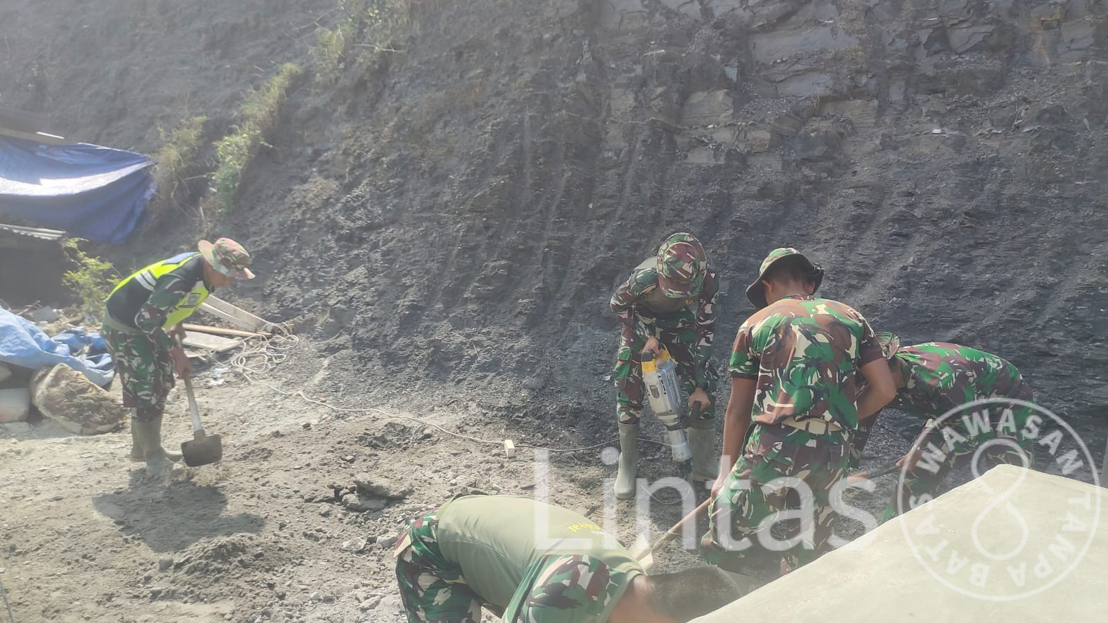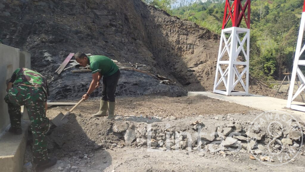 Pengerjaan melibatkan enam personel Koramil 09/Ketol dipimpin Kapten Inf Iwan Mulyawan serta 13 personel Yon TP 854 dipimpin Serka Hasanudin Hasibuan. Saat ini pekerjaan difokuskan pada plester abutmen angkur seling, perapihan jalan masuk, pengecatan dan pengelasan tiang tower, dengan dukungan material yang memadai di lokasi.