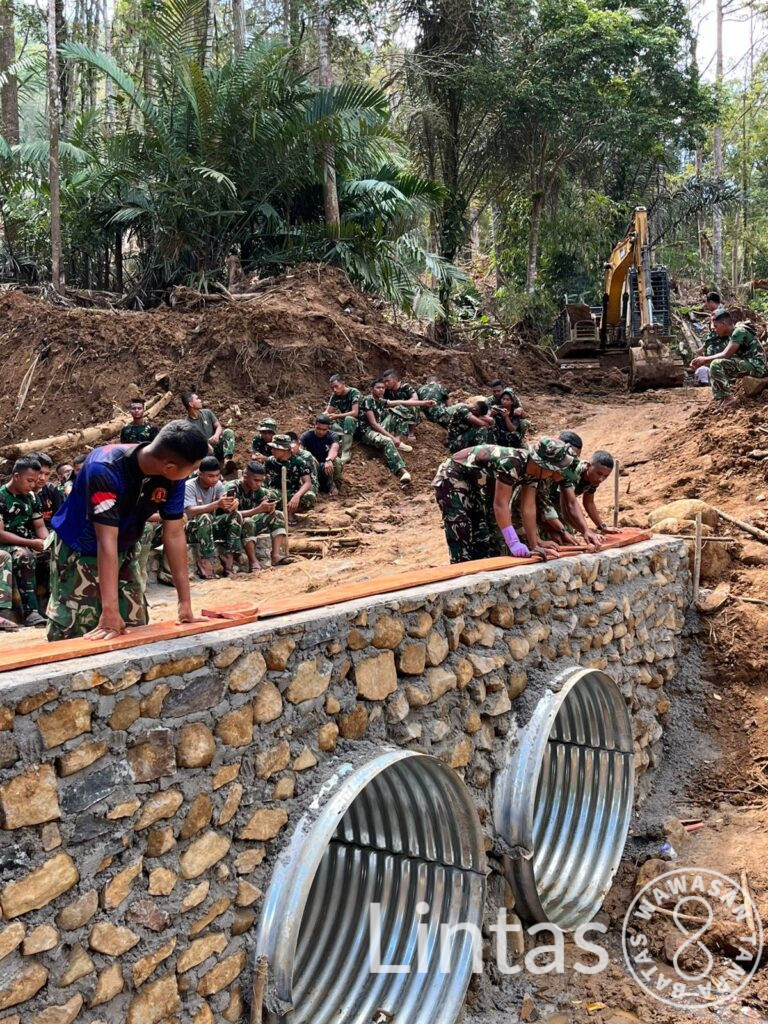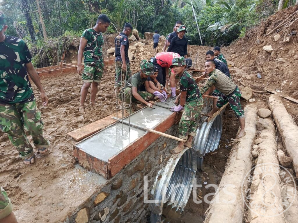 Pengerjaan melibatkan personel Yon TP 908/GD, Yonzipur I/DD, Zibang Sibolga, serta Babinsa Koramil 04/Pinangsori, bersama pemerintah desa dan warga setempat. Proses pembangunan didukung satu unit alat berat excavator serta material pondasi dan konstruksi. Jembatan Aramco berdiameter satu meter dengan panjang enam meter telah terpasang dengan baik di kedua sisi sungai.