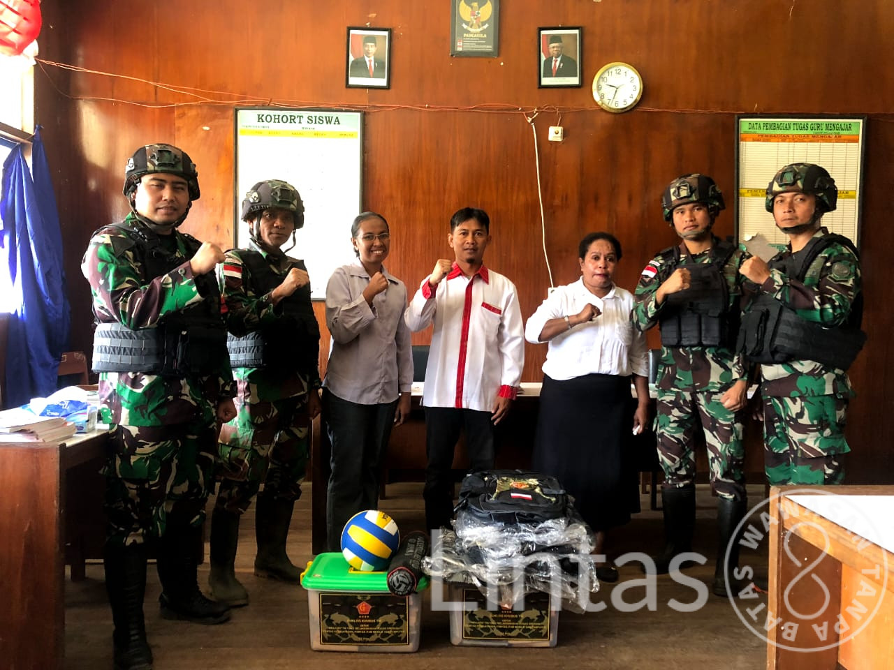 Keerom ~ Peduli pendidikan demi mencerdaskan generasi penerus bangsa di wilayah perbatasan, Pos Ubrub Satgas Yonif 310/KK berikan bantuan berupa buku pelajaran dan buku bacaan, alat olahraga serta perlengkapan sekolah bagi siswa-siswi SMPN 1 Web di Distrik Web, Kabupaten Keerom, Papua, Kamis (22/10/2024).