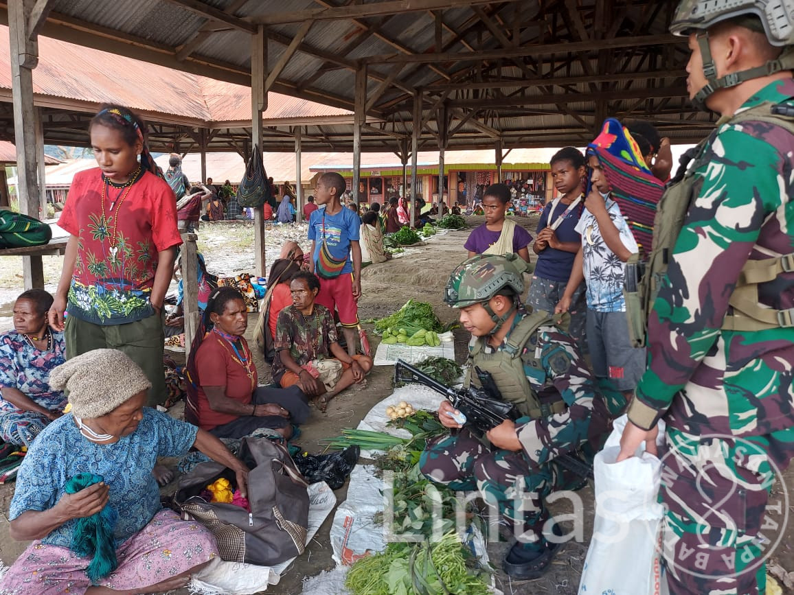Satgas Yonif 323 Buaya Putih Melalui TK Sinak Pimpinan Wadansatgas Mayor Inf Firman Permana Melaksanakan program (ROSITA) atau Borong Hasil Tani milik Mama mama Papua yang membawa dan menjual seluruh hasil taninya di Pasar Sinak, Kampung Gigobak, Distrik Sinak, Kabupaten Puncak, Papua Tengah, Senin (02/09/24)