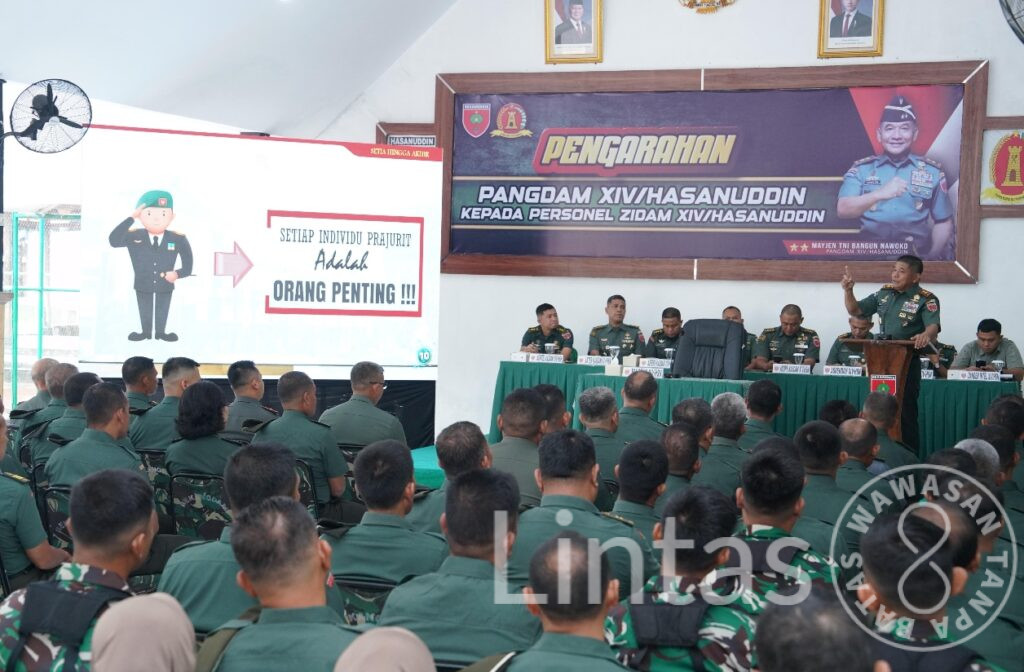 Makassar — Di tengah semangat pengabdian prajurit Zeni, Pangdam XIV/Hasanuddin Mayjen TNI Bangun Nawoko hadir langsung memberikan pesan inspiratif dan motivasi kepada seluruh prajurit di Markas Zeni Kodam (Zidam) XIV/Hsn. Kehadiran Pangdam disambut antusias oleh Kazidam Kolonel Czi Prastiwanto, S.E., M.I.Pol., bersama jajaran prajurit, bertempat di Aula Zidam, Jl. Rajawali, Kota Makassar. Kamis (8/1/2026).