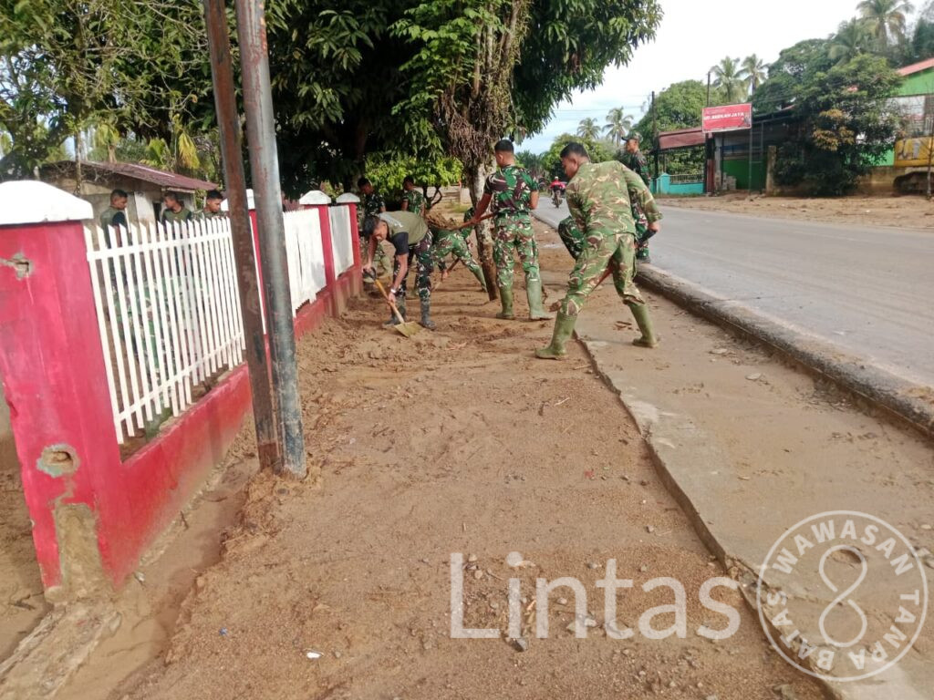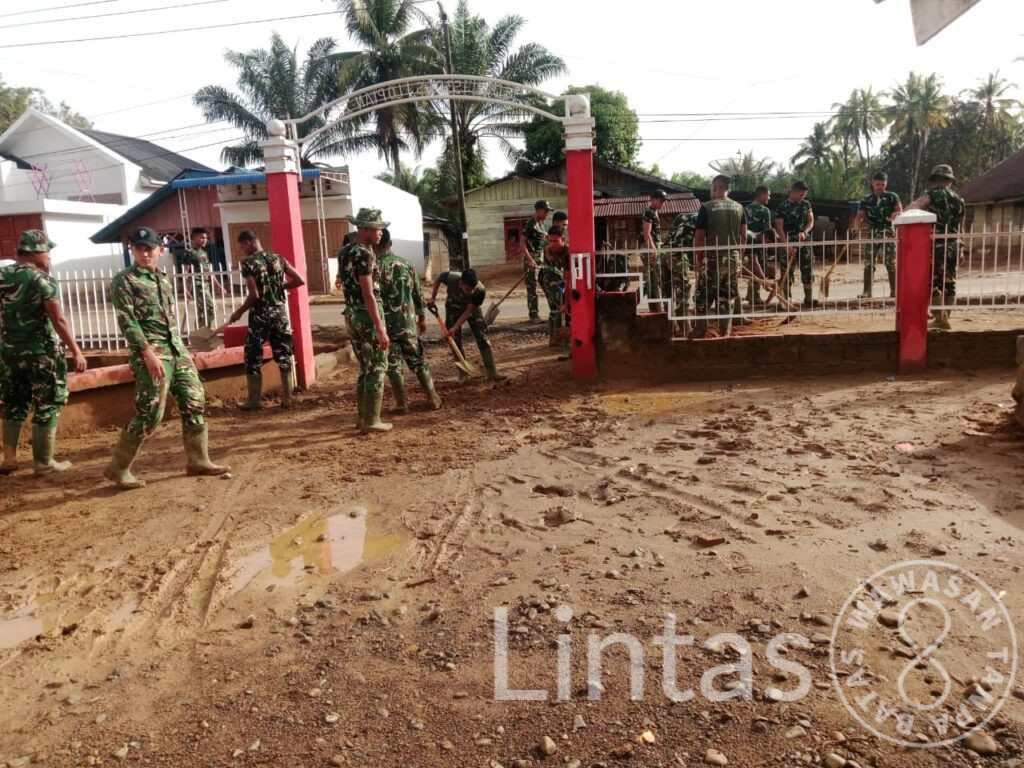 Satgas Penanggulangan Bencana Alam (Gulbencal) Kodam I/Bukit Barisan bergerak menormalkan lingkungan sekolah yang sebelumnya tertutup lumpur dan material banjir. Pekerjaan meliputi perataan taman dan halaman, pembersihan teras dan ruang kelas, serta pembersihan lantai dan dinding bangunan.