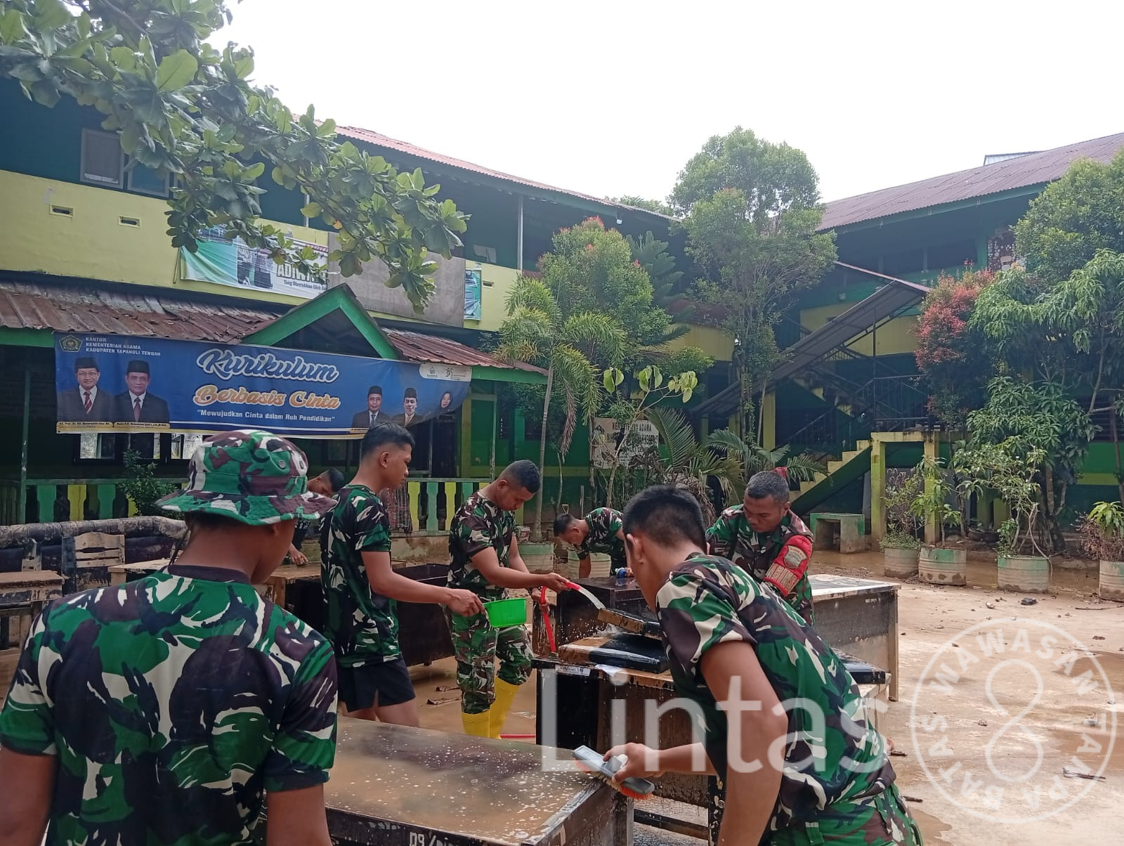 Tapanuli Tengah, tniad.mil.id — Satgas Penanggulangan Bencana Alam (Gulbencal) Kodam I/Bukit Barisan bersama para guru melaksanakan pembersihan lingkungan MIN 7 Sibuluan Nalambok, Kecamatan Sarudik, Kabupaten Tapanuli Tengah, Rabu (4/2/2026), guna memulihkan kondisi sekolah pascabanjir dan tanah longsor agar kembali layak digunakan untuk Kegiatan Belajar Mengajar (KBM).