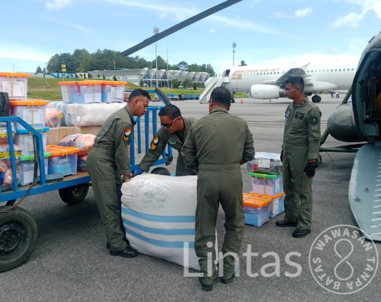 Menggunakan heli Mi-17 dan Bell 412, tim penerbang melaksanakan misi air dropping logistik berupa makanan siap saji, beras, mie instan, biskuit, dan kebutuhan pokok lainnya untuk masyarakat yang hingga hari ini masih terputus aksesnya. Kondisi medan dan cuaca yang tidak memungkinkan untuk pendaratan membuat distribusi dilakukan dengan teknik menjatuhkan bantuan dari udara secara terukur di titik yang telah ditentukan.