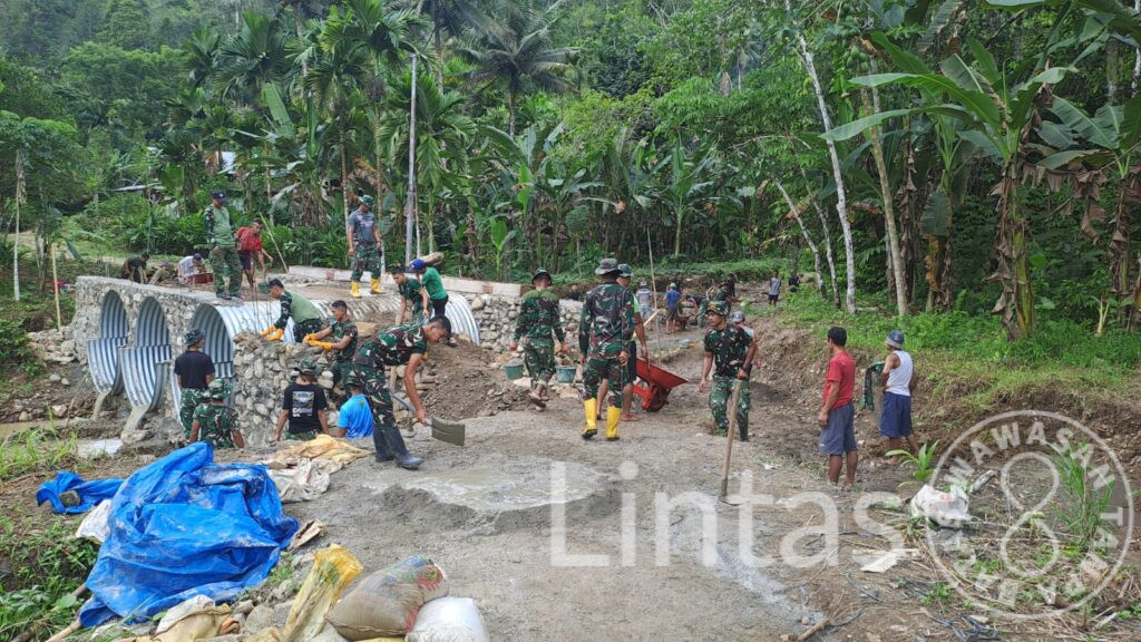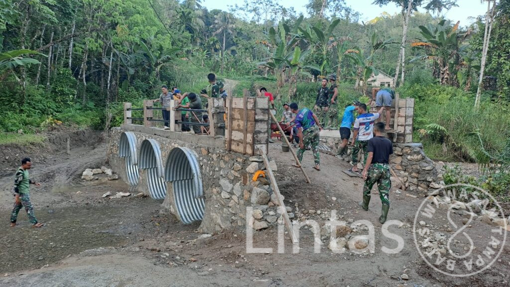 Pengerjaan jembatan dilaksanakan oleh personel Kodim 0213/Nias bersama Yon TP 903/Baluseda melalui semangat gotong royong dengan masyarakat setempat. Sinergi tersebut mempercepat seluruh tahapan pembangunan, mulai dari perakitan struktur pipa baja, pembuatan pondasi, penimbunan material, pemadatan tanah, hingga pengecoran dinding sayap.