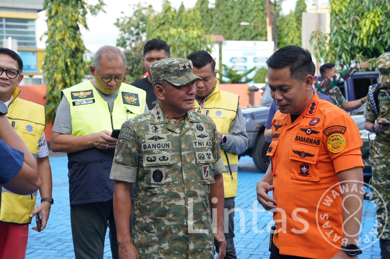 Maros — Pangdam XIV/Hasanuddin Mayjen TNI Bangun Nawoko melakukan pemantauan langsung jalannya proses pencarian dan pertolongan (SAR) pesawat ATR 42-500 yang dilaporkan hilang kontak di sekitar wilayah Leang-Leang Kabupaten Maros. Pemantauan tersebut dilaksanakan dari Kantor Basarnas, Jl. Bandara Sultan Hasanuddin, Kabupaten Maros, Sabtu (17/1/2026).