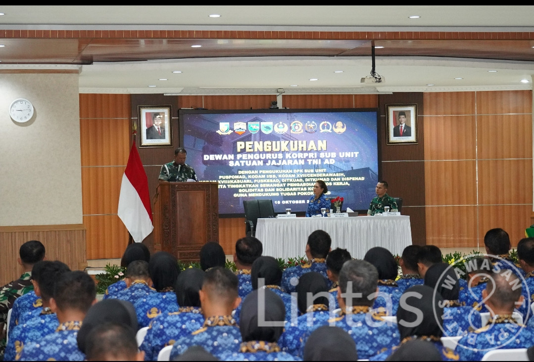 JAKARTA, tniad.mil.id – “Korpri sebagai wadah berhimpun ASN TNI AD, bukan sekadar wadah organisasi, melainkan pilar penting yang menopang profesionalisme, loyalitas, dan semangat pengabdian ASN dalam mendukung tugas pokok Angkatan Darat”. Demikian pesan yang disampaikan Ketua Dewan Pengurus Korpri (DPK) Unit TNI AD, drg. Nora Tristyana, M.A.R.S., dalam acara Pengukuhan Dewan Pengurus Korpri (DPK) Sub Unit Satuan Jajaran (Satjar) TNI AD yang digelar di Gedung Gatot Soebroto, Markas Pusat Polisi Militer Angkatan Darat (Mapuspomad), Jakarta, Kamis (16/10/2025).