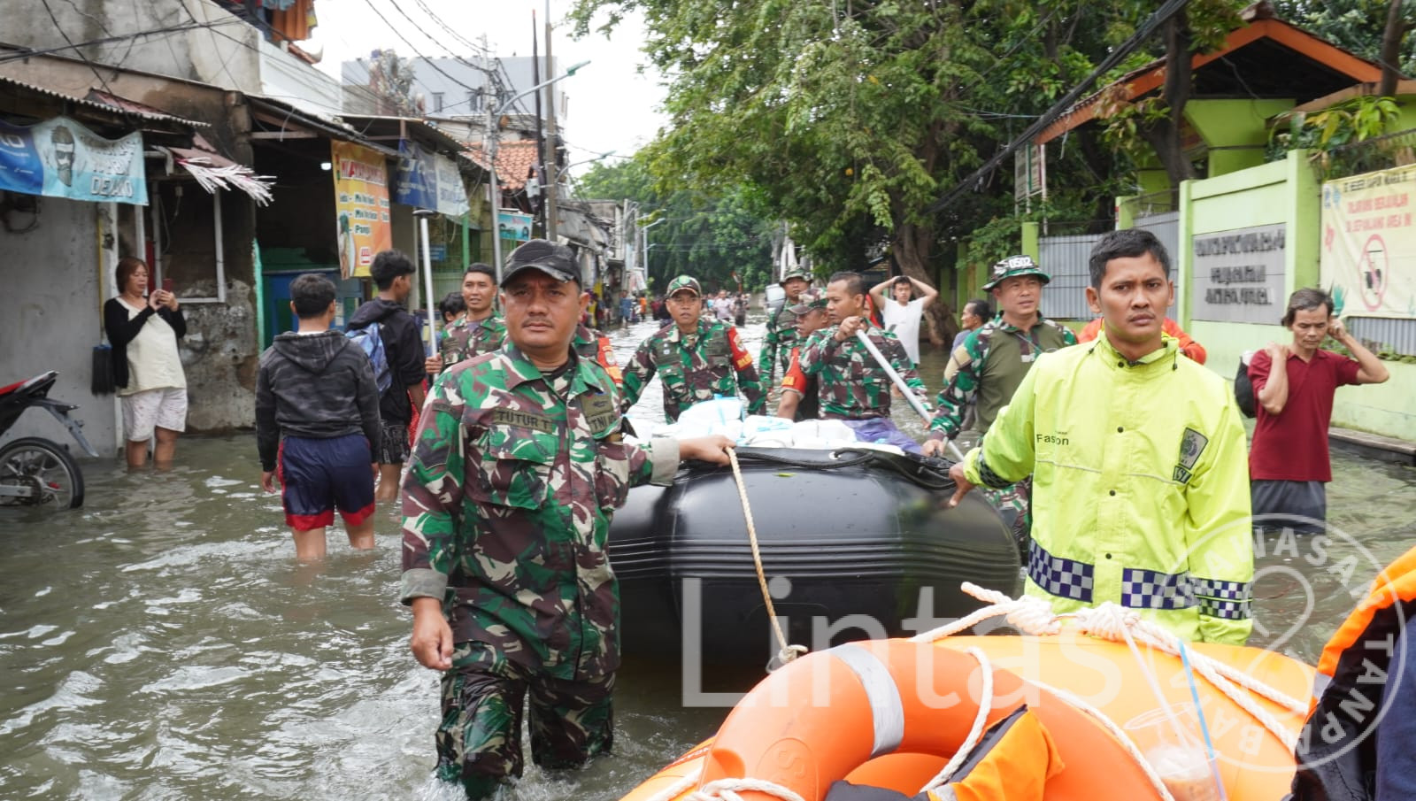 Banjir yang terjadi akibat curah hujan tinggi dalam beberapa hari terakhir menyebabkan meluapnya aliran kali dan merendam permukiman warga. Menyikapi kondisi tersebut, personel Kodim 0502/Jakarta Utara dan unsur BKO dari Yonif TP 843 PYV dan Yonif TP 899/BSG segera turun ke lapangan untuk membantu evakuasi warga serta penanganan dampak banjir.