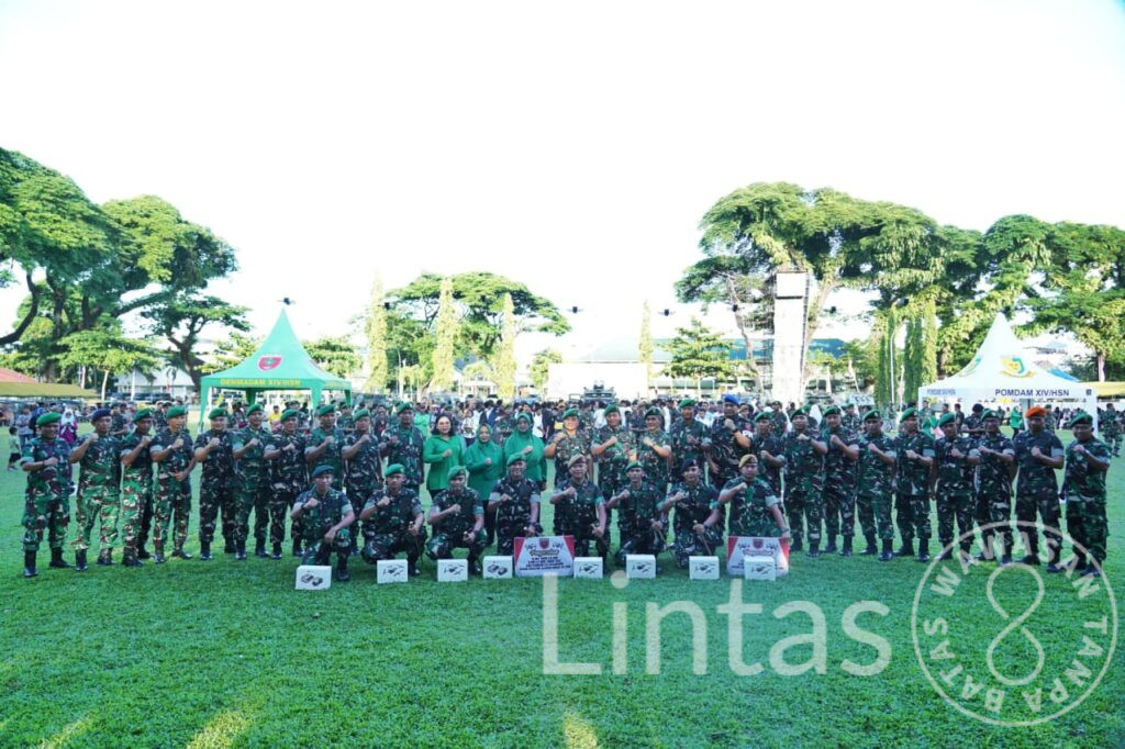 “Ada bantuan dari Pangdam XIV/Hsn berupa 18 unit drone, serta beras 5 kilogram sebanyak 250 sak bagi para dhuafa, ojek, dan tukang becak. Kami juga menerima bantuan kendaraan taktis Maung dari Presiden RI Prabowo Subianto kepada Panglima TNI, Kasad, selanjutnya kepada Pangdam sebanyak 38 unit, Kami menyampaikan terima kasih kepada pimpinan kami dan Presiden RI atas perhatian dan dukungan kesejahteraan dan operasional bagi prajurit di lapangan,” ucapnya.