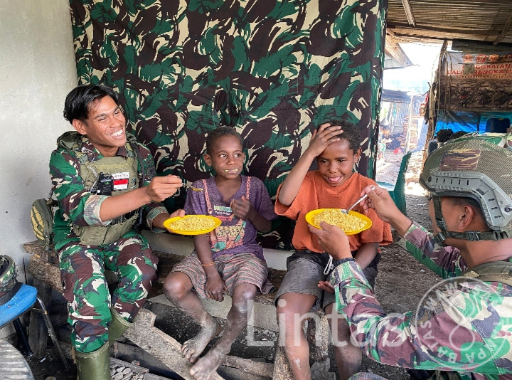 Ilaga Puncak, – Satuan Tugas Batalyon Infanteri (Satgas Yonif) Raider 323/Buaya Putih Kostrad, salah satu Satuan Jajaran Komando Operasi HABEMA di Papua, melaksanakan Kegiatan Teritorial Komunikasi Sosial (Komsos) berupa santap siang bersama anak-anak