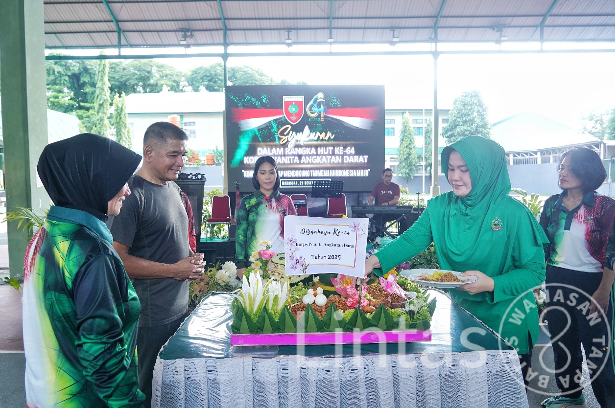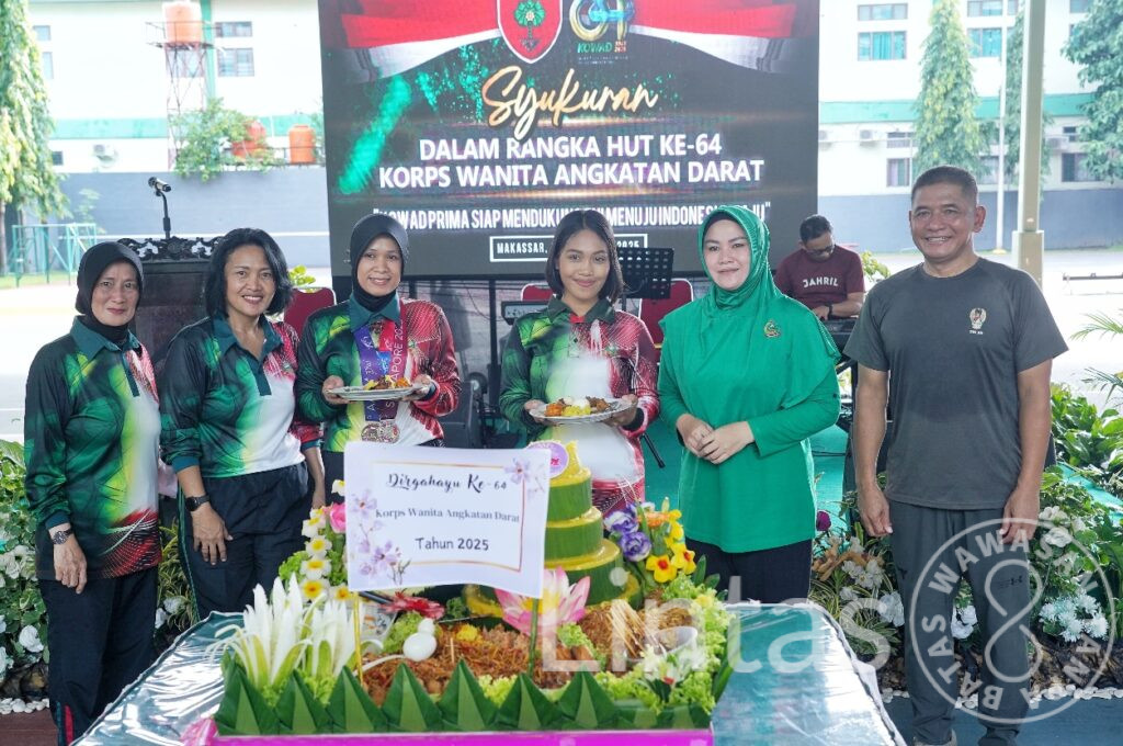 Makassar — Suasana penuh semangat dan kebanggaan mewarnai Syukuran Hari Ulang Tahun (HUT) ke-64 Korps Wanita Angkatan Darat (Kowad) Tahun Anggaran 2025 yang dihadiri Pangdam XIV/Hasanuddin Mayjen TNI Bangun Nawoko bersama Ketua Persit Kartika Chandra Kirana PD XIV/Hasanuddin, Ny. Renny Bangun Nawoko dan Pejabat Utama (PJU) Kodam, yang berlangsung di GOR Hasanuddin, Jl. Jenderal Sudirman, Kota Makassar. Selasa (23/12/2025).