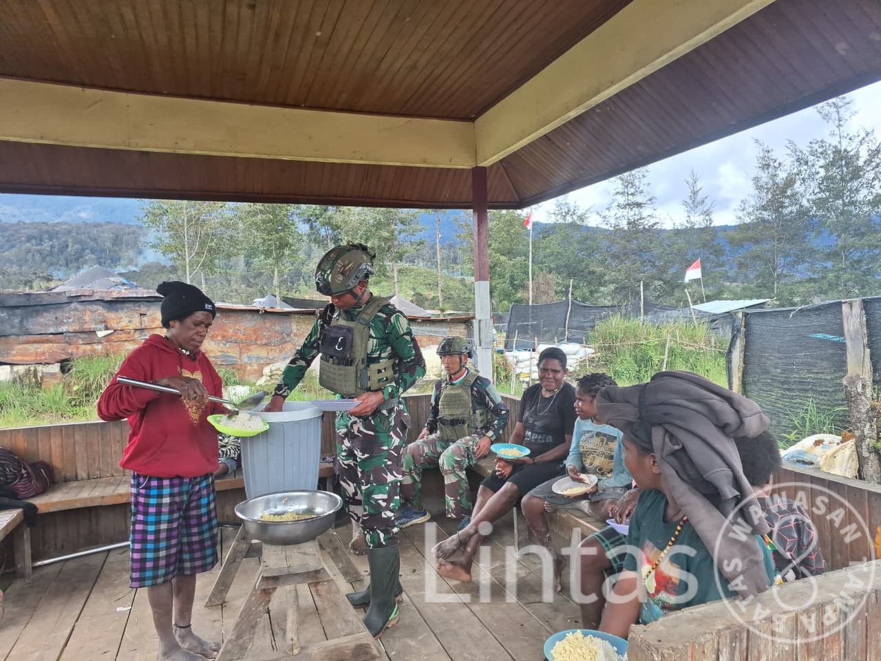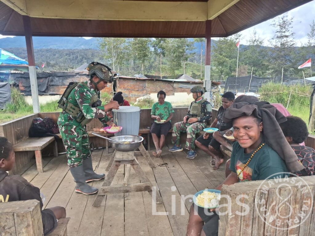 EROMAGA, PUNCAK – Suasana akrab dan penuh tawa pecah di halaman Pos Eromaga, Kabupaten Puncak, Papua. Bukan suasana tempur yang tegang, melainkan kemeriahan makan bersama antara prajurit Satgas Yonif 700/WYC dan warga Kampung Eronggobak. Kegiatan yang merupakan bagian dari Pembinaan Teritorial (Binter) terbatas ini jadi bukti nyata kalau TNI dan rakyat memang satu saudara,.pada (05/09/2025).