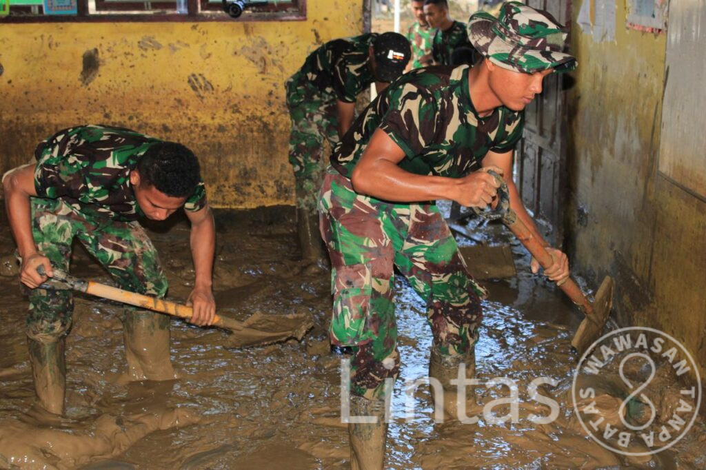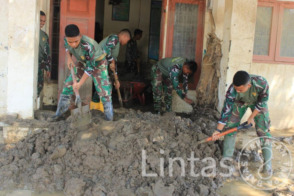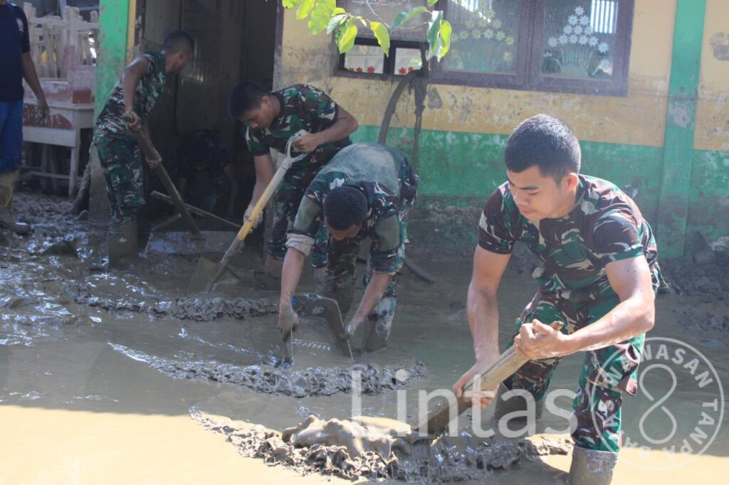 Kegiatan pembersihan dihadiri langsung Komandan Yonif TP 857/GG Letnan Kolonel Inf Hervin Rahadian Jannat, S.H., bersama Pasi Intel Yonif TP 857/GG Letda Inf Rizal Aprianto. Sebanyak satu SST atau 22 prajurit yang dipimpin Dpp Letda Inf Muhammad Yuspi dikerahkan untuk membersihkan lumpur di lingkungan sekolah dengan peralatan sederhana secara gotong royong.