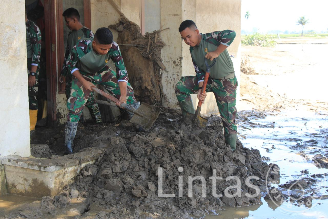 • Masih Tertutup Lumpur, Prajurit Yonif TP 857/GG Bersihkan MTsN 2 Pidie Jaya