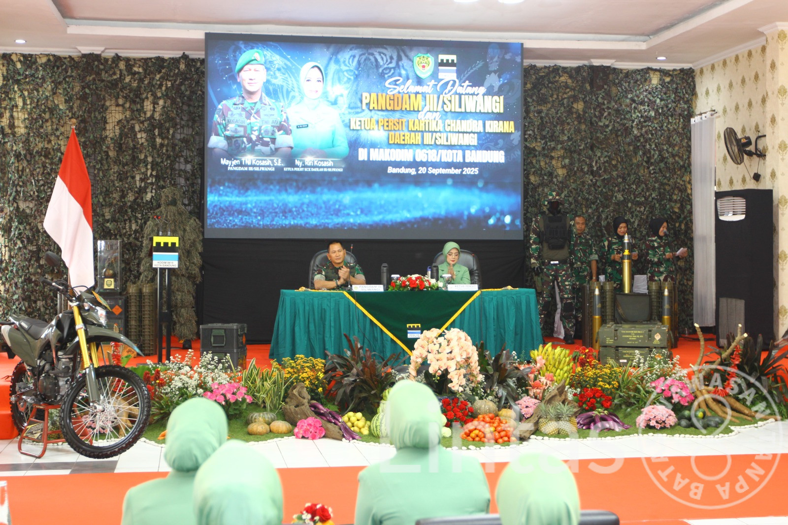 Bandung, – Pangdam III/Siliwangi, Mayjen TNI Kosasih, S.E., didampingi oleh Ketua Persit Kartika Chandra Kirana Daerah III/Slw, Ny. Riri Kosasih, melaksanakan kunjungan kerja ke Kodim 0618/Kota Bandung Jl. Bangka No. 2, Kota Bandung. Sabtu, (20/09/2025) dan dihadiri oleh Kasdam III/Slw, Irdam III/Slw, Kapoksahli Pangdam III/Slw, serta para Asisten Kasdam III/Slw, Pa Lo TNI AL, dan TNI AU.
