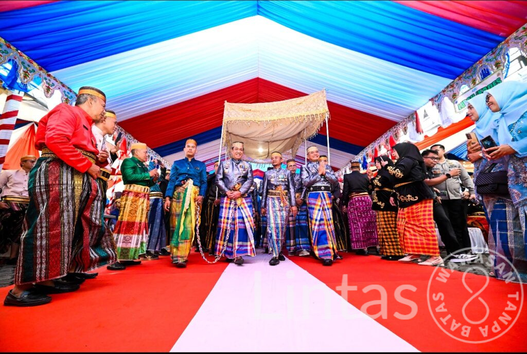 Bone – Pangdam XIV/Hasanuddin Mayjen TNI Bangun Nawoko, didampingi Ketua Persit Kartika Chandra Kirana (KCK) Daerah XIV/Hasanuddin, Ny. Renny Bangun Nawoko, menghadiri acara Mattompang Arajang puncak peringatan Hari Jadi Bone (HJB) ke-696 Tahun 2026. Kegiatan tersebut berlangsung khidmat di Rumah Jabatan (Rujab) Bupati Bone, Jl. Petta Ponggawae, Kelurahan Watampone, Kabupaten Bone. Senin (6/4/2026).