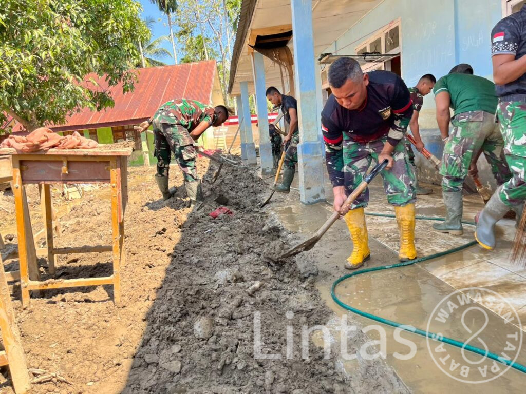 ACEH TENGAH, tniad.mil.id — Pascabanjir bandang dan tanah longsor yang menerjang wilayah Kecamatan Linge, Satgas Penanggulangan Bencana Alam (Gulbencal) Kodim 0106/Aceh Tengah bersama prajurit Yonif TP 854/DK dan warga menuntaskan pembersihan material lumpur serta kayu di SMPN 26 Takengon, Desa Reje Payung, Sabtu (14/2/2026). Dengan rampungnya pekerjaan tersebut, sekolah kini kembali siap digunakan untuk kegiatan belajar mengajar.