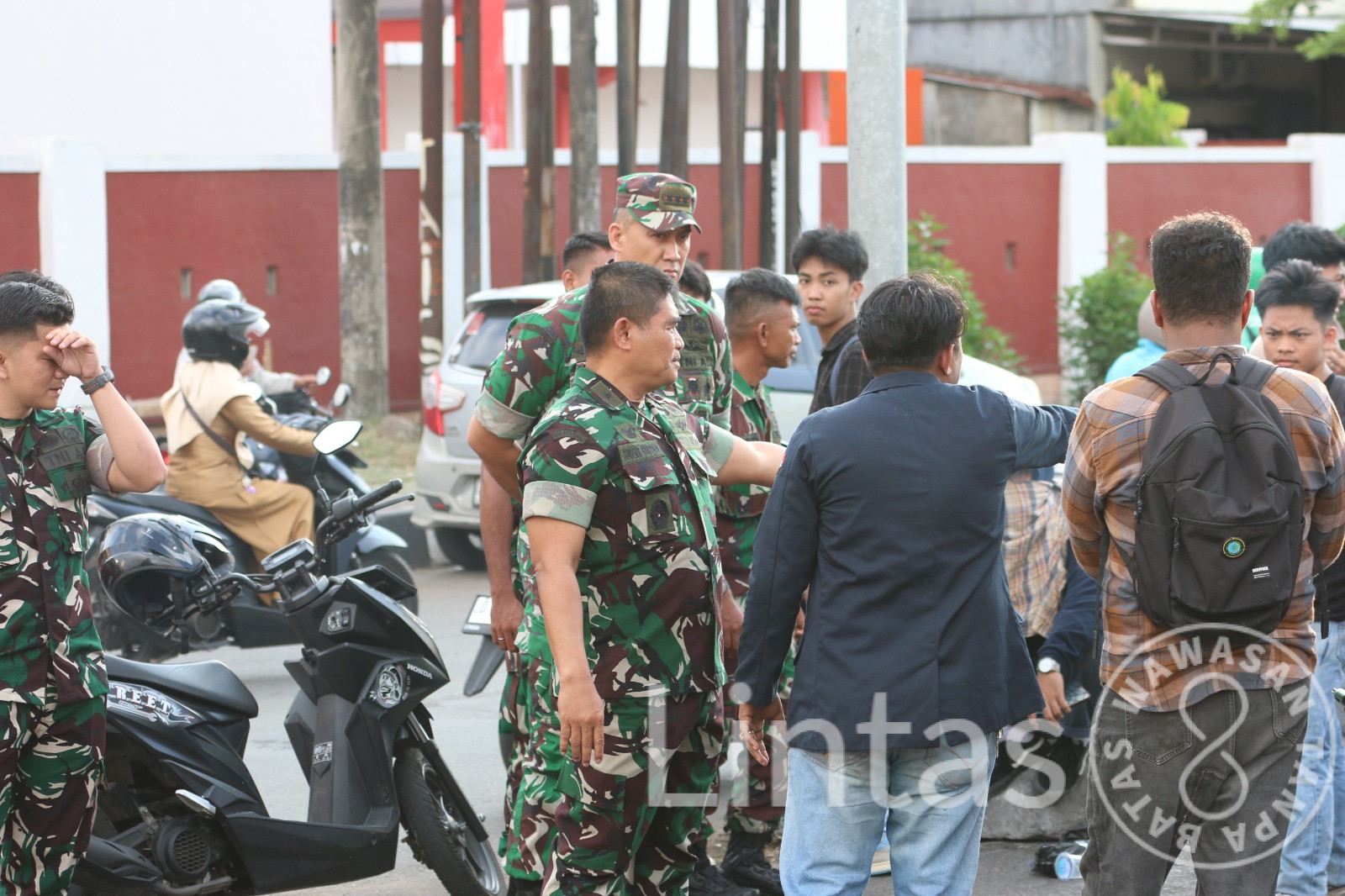 Makassar – Kepala Staf Kodam (Kasdam) XIV/Hasanuddin Brigjen TNI Sugeng Hartono, S.E., M.M., didampingi Dandim 1408/Makassar Kolonel Inf Frangki Susanto, S.E., turun langsung meninjau aksi unjuk rasa sejumlah mahasiswa dari Universitas Bosowa (Unibos) yang berlangsung di depan kampus Unibos, Jl. Urip Sumoharjo, Kota Makassar. Senin, (20/10/2025).