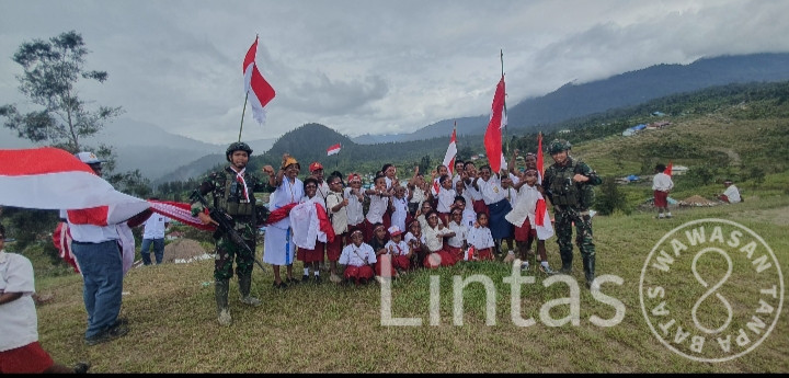Sinak Puncak, – Satuan Tugas Batalyon Infanteri (Satgas Yonif) Raider 323/Buaya Putih Kostrad, salah satu Satuan Jajaran Komando Operasi HABEMA di Papua, tengah melaksanakan tugas Operasi Pengamanan Perbatasan Mobil RI-PNG, di wilayah Kabupaten Puncak, Provinsi Papua Tengah, bersama masyarakat Sinak melaksanakan kegiatan Kirab dan Pengibaran Bendera Merah Putih di Bukit Sion Distrik Sinak, dalam rangka memperingati Hari Kemerdekaan ke-79 Republik Indonesia, Kamis (22/8/2024).