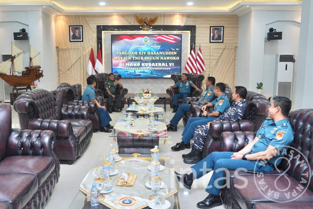 Kedatangan Pangdam XIV/Hasanuddin disambut hangat oleh Komandan Kodaeral VI Laksamana Muda TNI Andi Abdul Aziz, S.H., M.M., didampingi para Pejabat Utama Kodaeral. Dalam suasana penuh keakraban, kedua pimpinan melaksanakan dialog dan bertukar pandangan guna memperkuat koordinasi serta mendukung pelaksanaan tugas pertahanan dan keamanan wilayah.