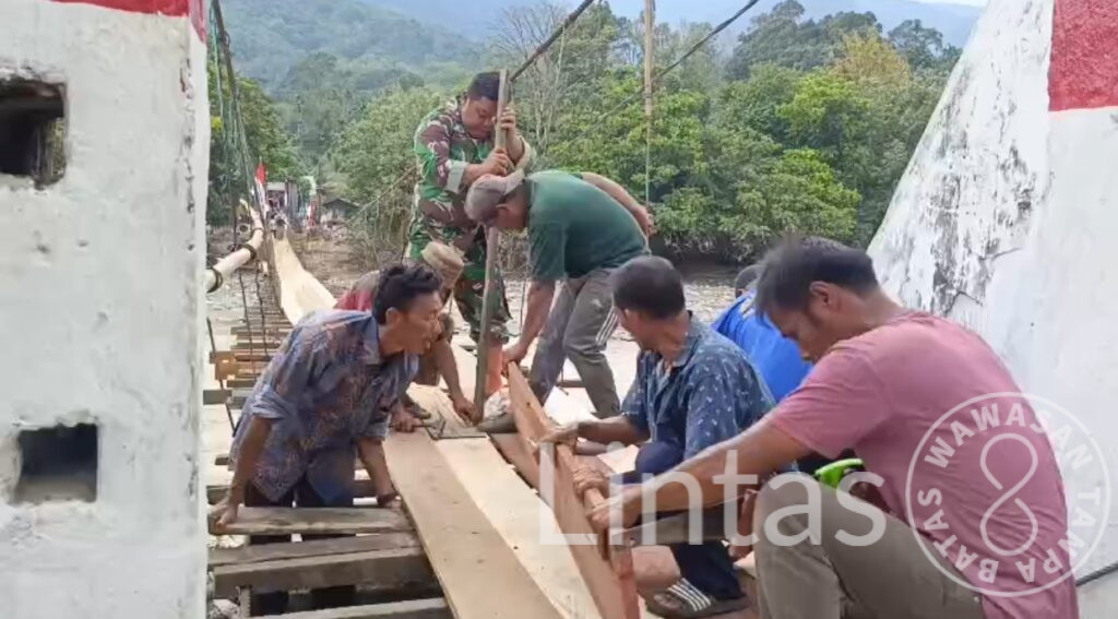 Aceh Tenggara – tniad.mil.id — Prajurit TNI AD dari Babinsa Posramil Darul Hasanah jajaran Kodim 0108/Aceh Tenggara, Kodam Iskandar Muda, bersama warga masyarakat berhasil merampungkan perbaikan jembatan gantung di Desa Buntul Kendawi, Kecamatan Darul Hasanah, Kabupaten Aceh Tenggara, Kamis (25/12/2026).