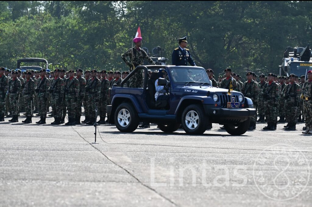 Maros – Kepala Staf Kodam (Kasdam) XIV/Hasanuddin, Brigjen TNI Sugeng Hartono, S.E., M.M., menghadiri Upacara Peringatan Hari Ulang Tahun (HUT) Ke-80 Tentara Nasional Indonesia (TNI) Tahun 2025, yang digelar di Apron Skadron Udara 5 Lanud Sultan Hasanuddin, Kabupaten Maros. Minggu (5/10/2025).
