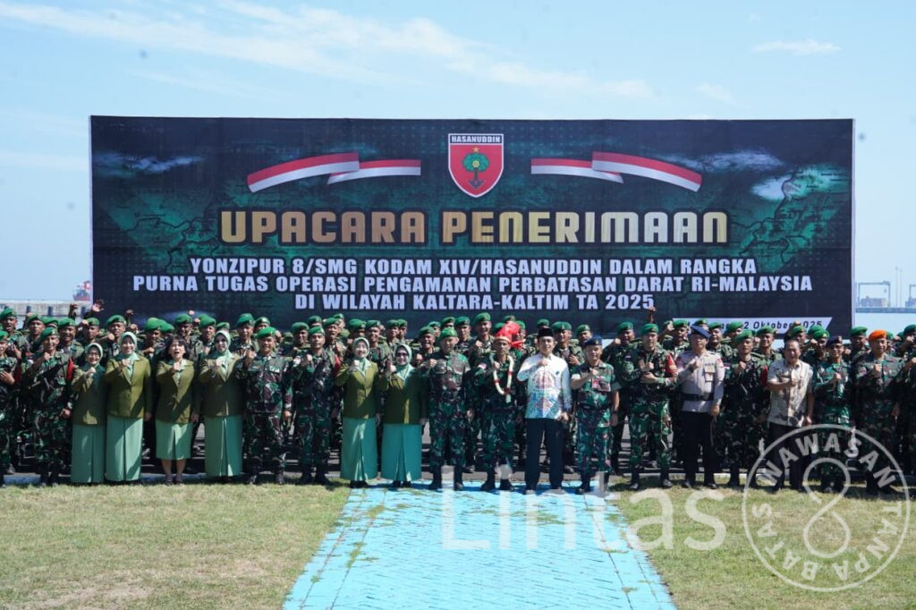 Makassar – Pangdam XIV/Hasanuddin Mayjen TNI Windiyatno memimpin Upacara Penerimaan Yonzipur 8/Sakti Mandra Guna (SMG) dalam rangka purna tugas operasi pengamanan perbatasan Republik Indonesia-Malaysia di wilayah Kalimantan Timur dan Kalimantan Utara TA. 2024-2025. Upacara digelar di Dermaga Layang, Kodaeral VI, Jl. Yos Sudarso, Kota Makassar, Kamis (02/10/2025).