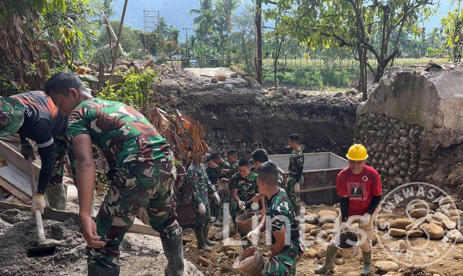 Pengerjaan jembatan melibatkan personel dari Zidam XX/TIB, Kodim 0308/Pasaman, serta Yonif 844/KB, yang bekerja bersama masyarakat setempat secara gotong royong. Sinergi yang terjalin menjadi cerminan kemanunggalan TNI dan rakyat dalam menghadapi situasi pascabencana.