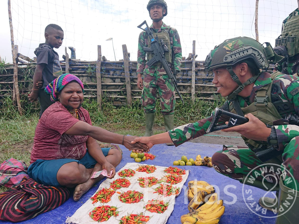 Prajurit Satgas Mobile Yonif 323 Buaya Putih membantu membeli hasil Tani masyarakat yang dijual mama-mama Papua didepan TK Pintu Jawa, Kab.Puncak, Papua, Selasa (19/06/2024)