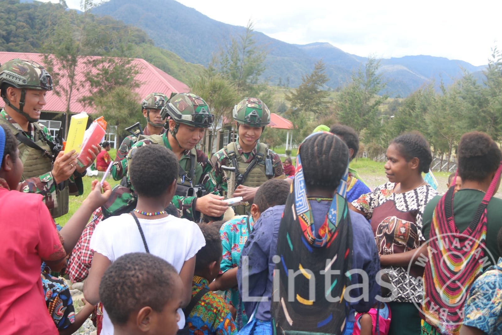 Berbagi keceriaan bersama Anak-anak Distrik Ilaga, Satgas Mobile Yonif 323 Buaya Putih memberikan buku dan alat tulis sekaligus memotivasi para anak-anak untuk giat belajar menuntut ilmu, Kampung Wako, Kabupaten Puncak, Papua, Kamis (27/06/2024).