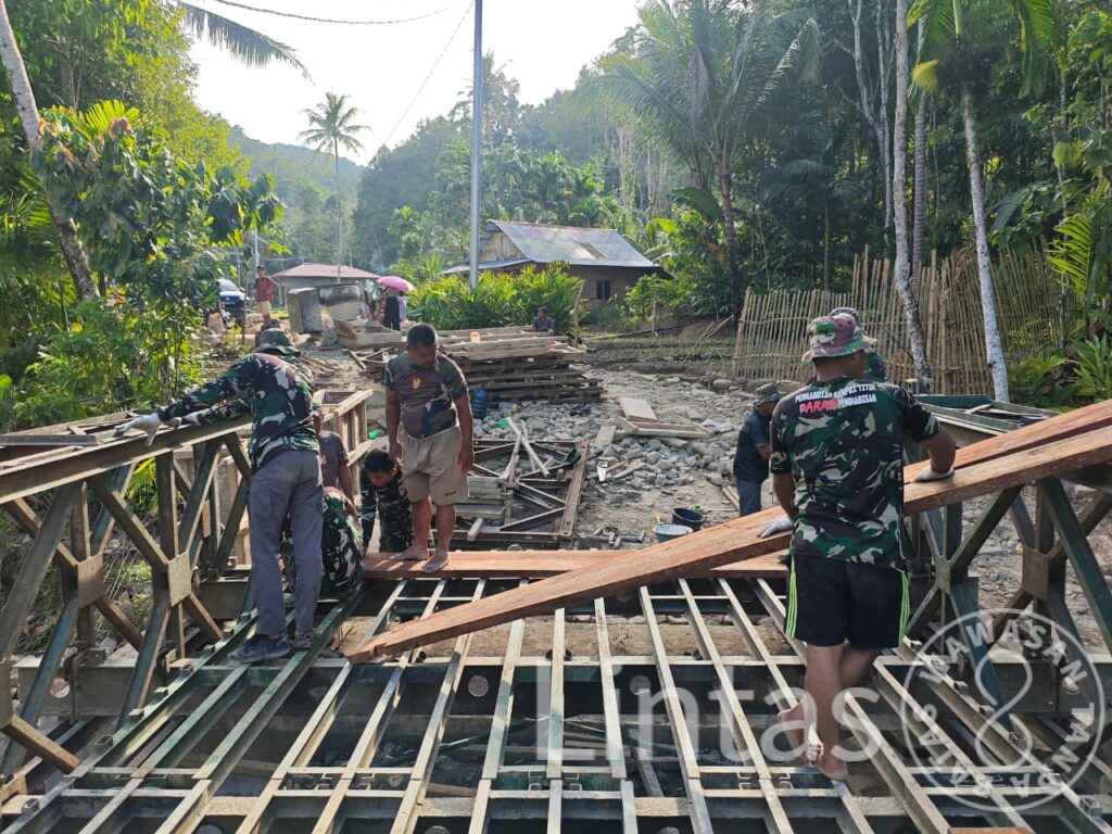 NIAS SELATAN, tniad.mil.id – Satgas Penanggulangan Bencana Alam (Gulbencal) Kodam I/Bukit Barisan menuntaskan pembangunan Jembatan Bailey yang menghubungkan Desa Sifalago Gomo dan Desa Balohili Gomo, Kecamatan Boronadu, Kabupaten Nias Selatan, Senin (2/3/2026). Rampungnya jembatan ini mengembalikan akses mobilitas warga yang sebelumnya terganggu.