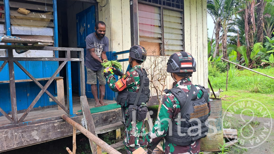 Disisi lain, Mias (42) salah satu warga kampung mengucapkan terima kasihnya kepada personil Satgas. Dirinya mengaku senang mendapat sayuran dan sembako yang diberikan.