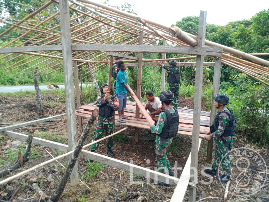 Keerom ~ Berbakti kepada orang tua adalah kewajiban setiap anak, Pos Kalipao Satgas Yonif 310/KK bantu Lukas Muwenda (35) bangunkan rumah untuk kedua orang tuanya di Kampung Yuwainda, Distrik Waris, Kabupaten Keerom, Selasa (19/3/2024).