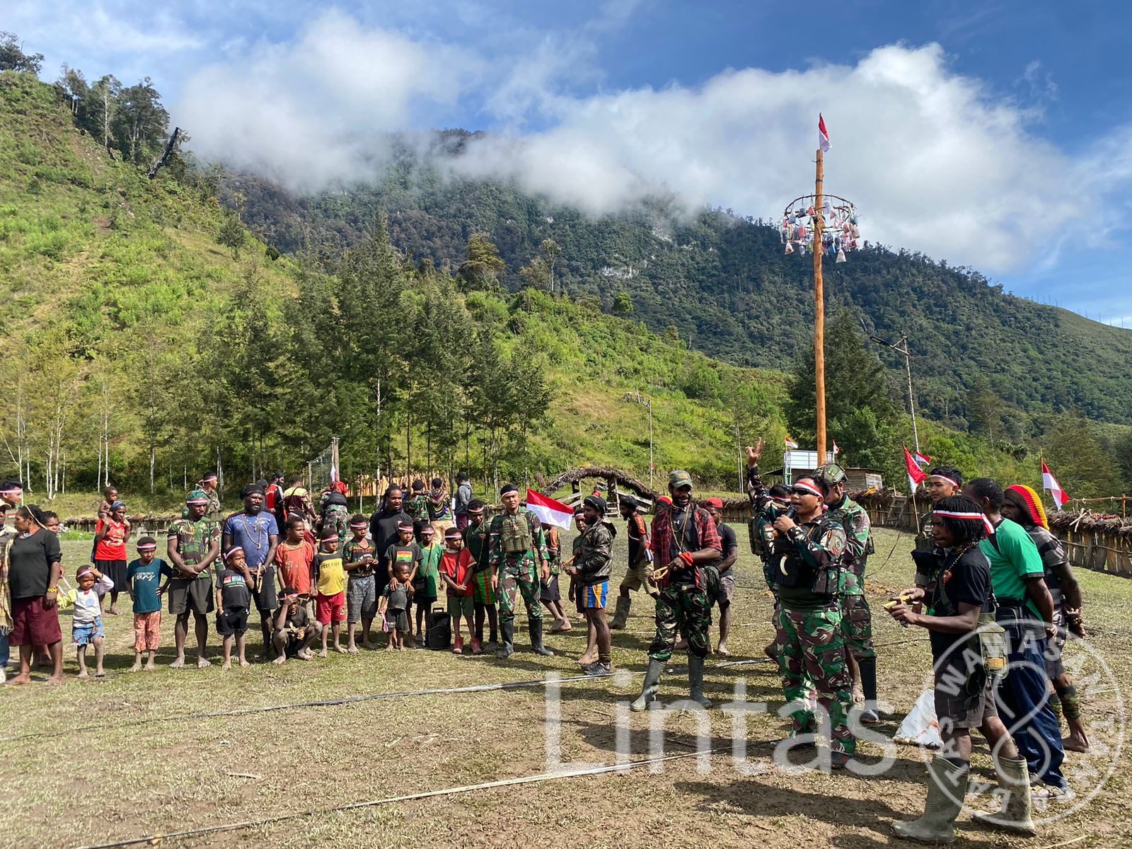TK Wuloni Satgas Mobile Yonif 323 Buaya Putih Pimpinan Kapten Inf Honest Mengajak Masyarakat Kampung Wuloni untuk meriahkan Perayaan HUT RI Ke-79 dengan menggelar Perlombaan, Kampung Wuloni, Distrik Ilaga Utara, Kabupaten Puncak, Papua Tengah, Senin (19/08/24)