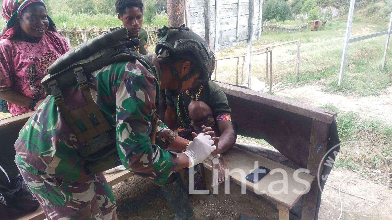 Dalam rangka memberikan pertolongan pertama kepada warga, Tim Kesehatan TK Mayuberi dengan sigap memberikan pertolongan pertama kepada Kaka Melkiaw Lokbene (26) yang terluka akibat terkena parang di bagian Tangan kiri nya di Distrik Ilaga Utara, Kabupaten Puncak, Papua Tengah, Selasa (03/09/24)
