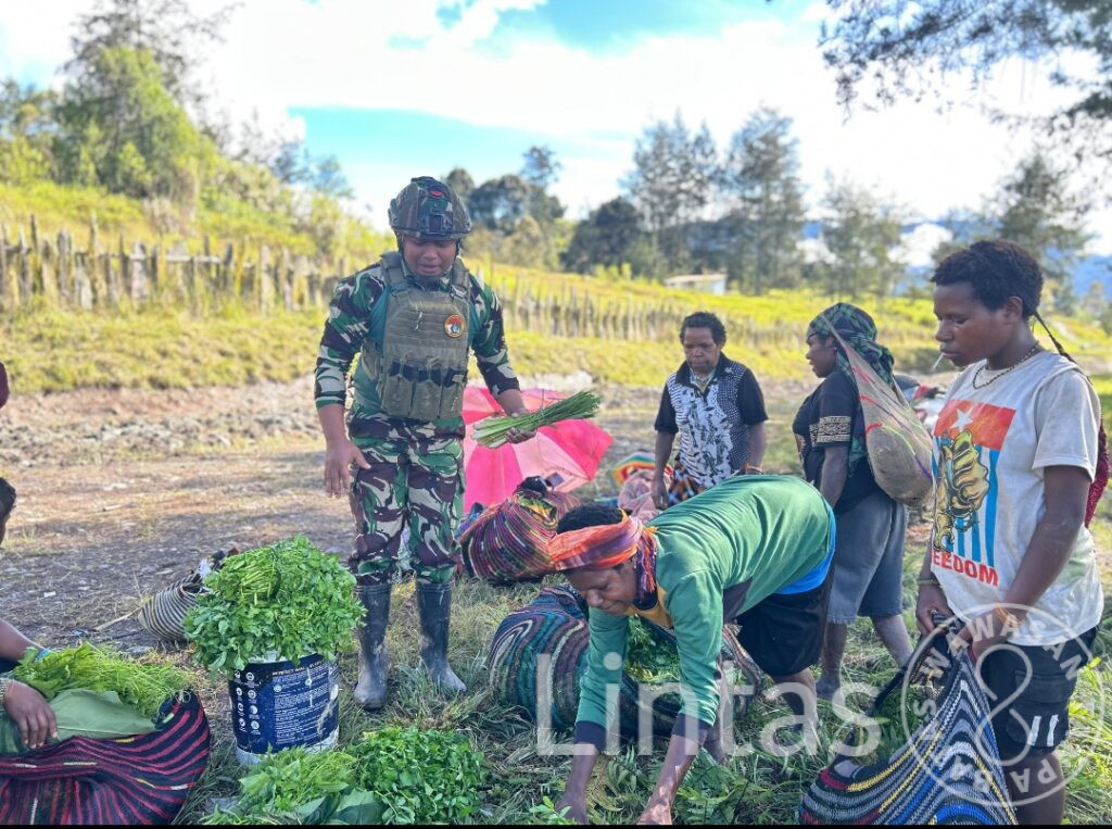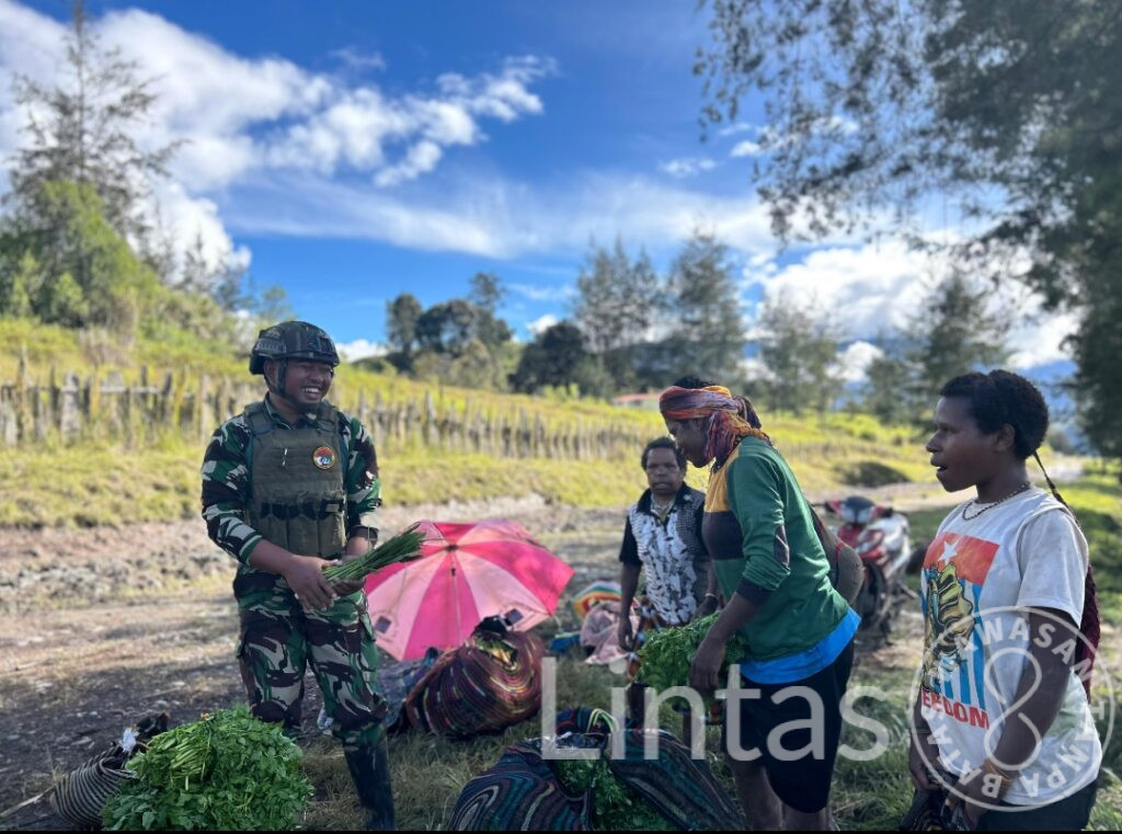 Dipimpin oleh Serda Irzal, kegiatan ini bukan sekadar transaksi jual beli, tetapi wujud nyata kepedulian TNI terhadap kesejahteraan masyarakat di daerah penugasan. Dengan senyum ramah, para prajurit mendatangi lapak sederhana milik warga, membeli hasil kebun berupa ubi, sayur mayur, dan buah khas pegunungan yang ditanam dengan penuh ketekunan oleh tangan-tangan mama Papua.