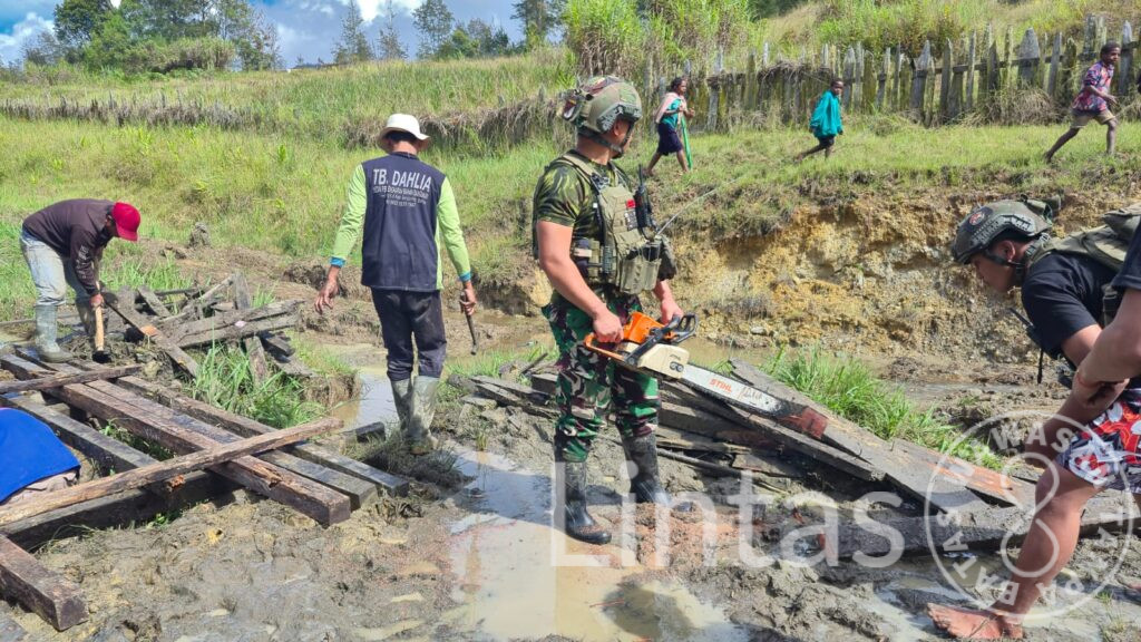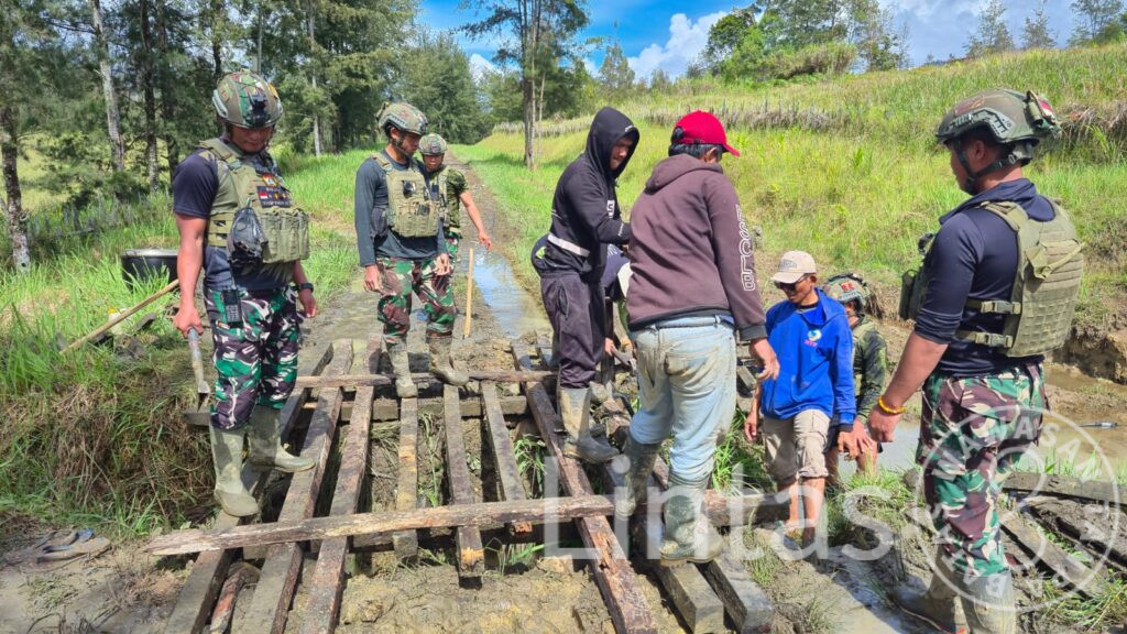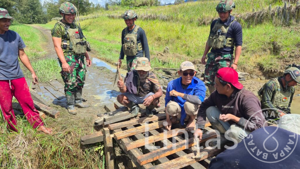 OMUKIA – Di tengah teriknya matahari Pegunungan Tengah Papua, dentingan palu dan deru semangat menggema menggantikan suara senyapnya lalu-lalang warga. Personel Pos Bendungan Satgas Yonif 700/Wyc, dengan semangat bak pahlawan tanpa pamrih, terjun langsung memperbaiki jembatan penghubung di Kampung Nipuralome, Distrik Omukia, Kabupaten Puncak, (26/09/2025).