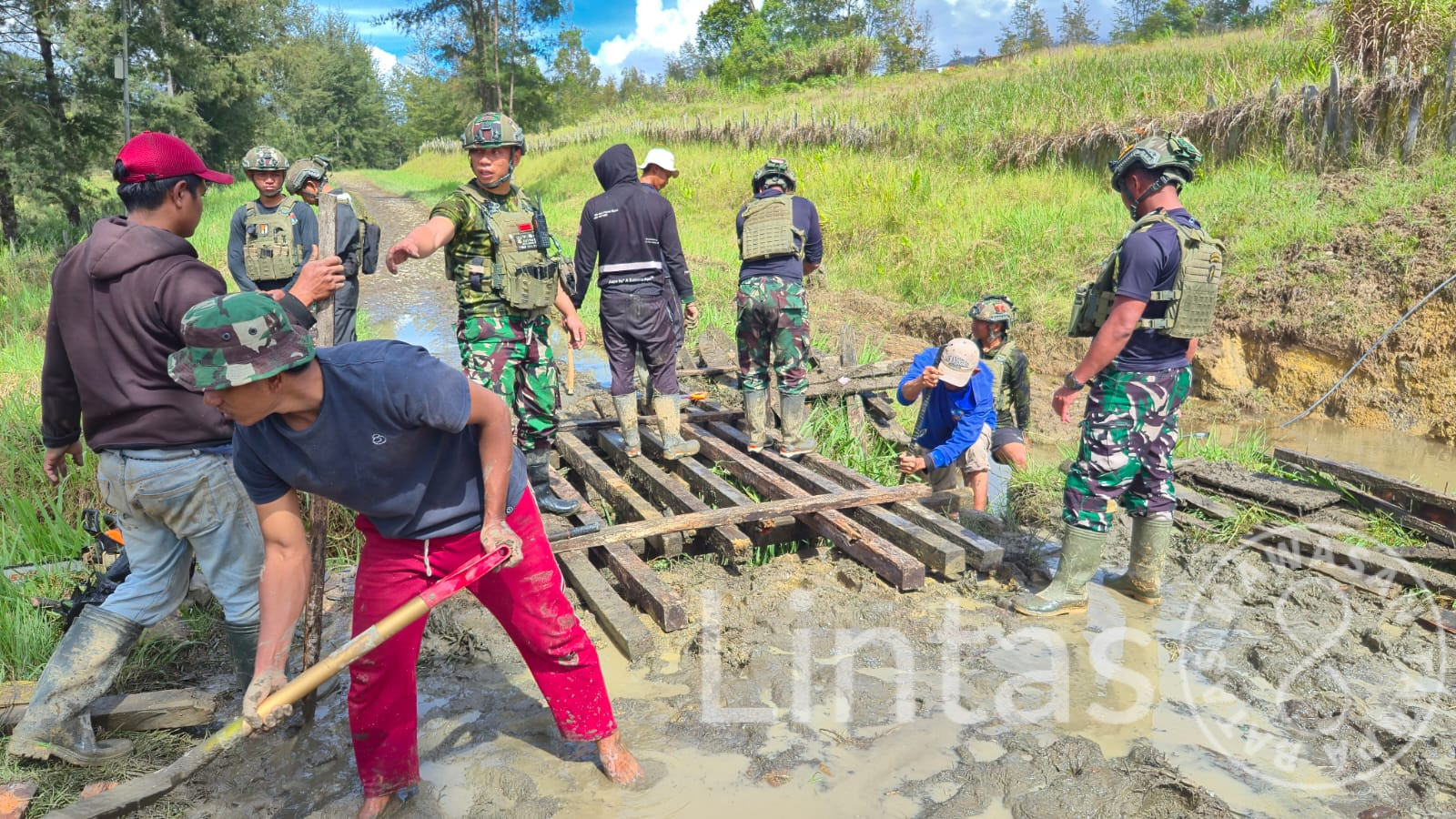 Dipimpin langsung oleh Komandan Pos Bendungan, Letda Inf Risal, prajurit-prajurit ini bekerja keras. Dengan peralatan seadanya dan didominasi tenaga manusia, mereka bahu-membahu membenahi struktur jembatan yang rapuh. Tak ada keluh kesah yang terdengar, yang ada hanya senyum dan canda yang mencairkan kebekuan jarak antara TNI dan rakyat. Setiap paku yang tertancap, setiap papan yang terpasang, adalah bukti nyata pengabdian para prajurit di ujung timur Indonesia.