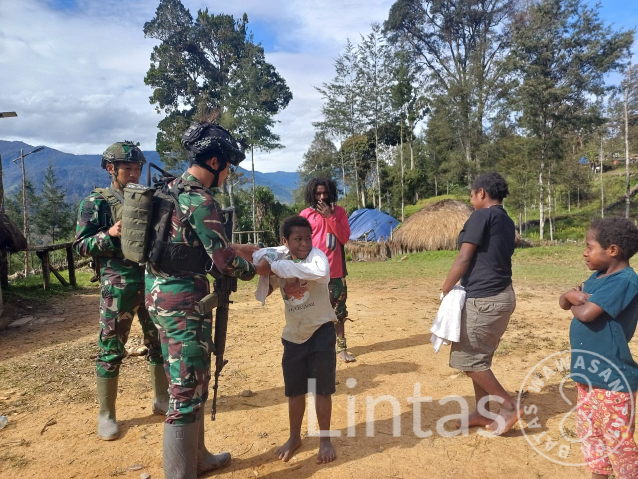 Prajurit Satgas Yonif 323 Buaya Putih melaksanakan kegiatan berbagi Pakaian Layak Pakai di Kampung Wuloni, Distrik Ilaga Utara, Kabupaten Puncak, Papua Tengah, Rabu (07/08/2024).