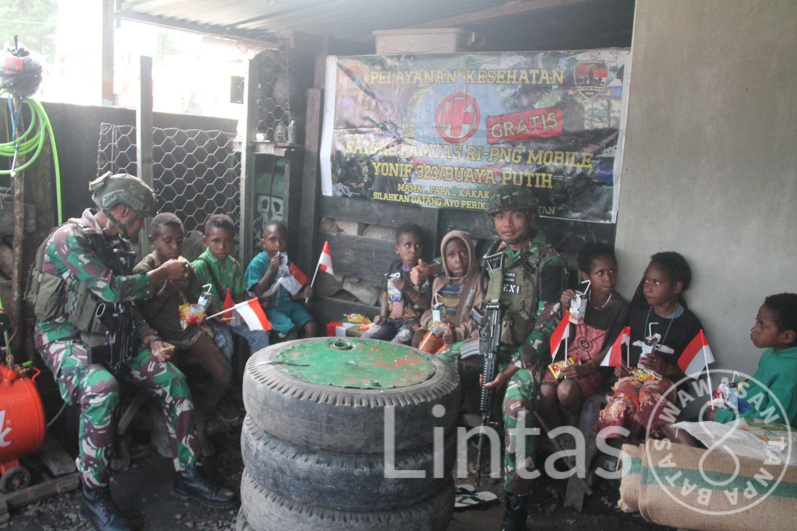 Anak-anak mendatangi pos untuk Mengajak bermain personel Pos Satgas Yonif 323 Buaya Putih Karena merasa senang dengan kehadiran Abang-Abang dari Pos Satgas Yonif 323 Buaya Putih