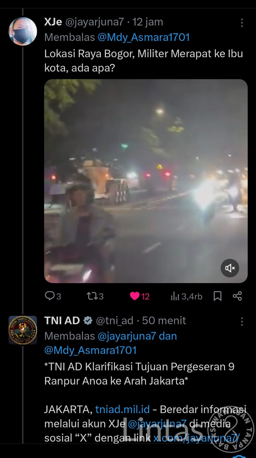JAKARTA, tniad.mil.id – Beredar informasi melalui akun XJe @jayarjuna7 di media sosial “X” dengan link https://x.com/jayarjuna7/status/1827742492915359827?t=2sNAb0Q-skxHs8jzK00EWA&s=08 berisi tayangan video tentang iring-iringan Kendaraan Tempur (Ranpur) Anoa dan Truk Militer yang melintas di jalan raya, didampingi narasi tulisan yang berbunyi “Lokasi Raya Bogor, Militer Merapat ke Ibu Kota, ada apa?”