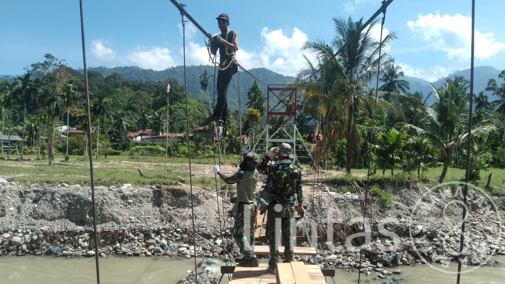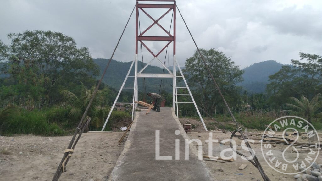 ACEH TENGGARA, tniad.mil.id – Perbaikan jembatan gantung penghubung Kecamatan Darul Hasanah dan Kecamatan Badar di Desa Mamas Indah, Kabupaten Aceh Tenggara, pada Selasa (3/3/2026) memasuki tahap akhir dengan progres mencapai 96 persen. Rampungnya jembatan ini akan segera memulihkan akses utama mobilitas masyarakat antar desa dan antar kecamatan.