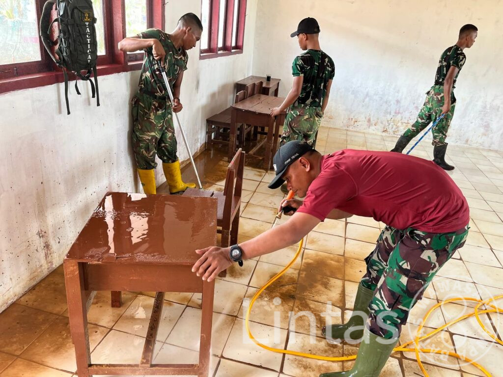Pembersihan difokuskan pada pengangkatan lumpur dari dalam ruang kelas, teras, serta lingkungan sekolah. Material tanah yang mengendap juga dibersihkan secara bertahap hingga seluruh area dinyatakan bersih, aman, dan layak digunakan kembali.