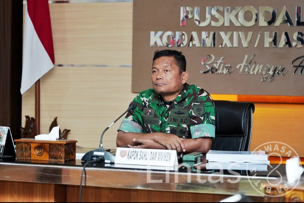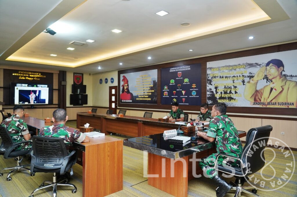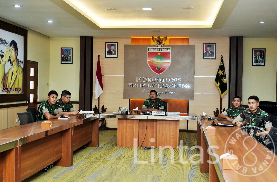 Makassar – Kepala Kelompok Staf Ahli (Kapoksahli) Pangdam XIV/Hasanuddin Brigjen TNI Musa David Marolop Hasibuan S.I.P, M.A.B., mengikuti Rapat Koordinasi (Rakor) Nasional Sinkronisasi Tata Ruang Pertahanan yang dipimpin oleh Deputi Bidang Koordinasi Pertahanan Negara dan Kesatuan Bangsa Kemenko Polkam RI Mayjen TNI Purwito Hadi Wardhono secara Video Conference (Vicon), bertempat di Ruang Vicon Puskodalops Makodam, Jl. Urip Sumoharjo, Kota Makassar. Rabu, (12/11/2025).